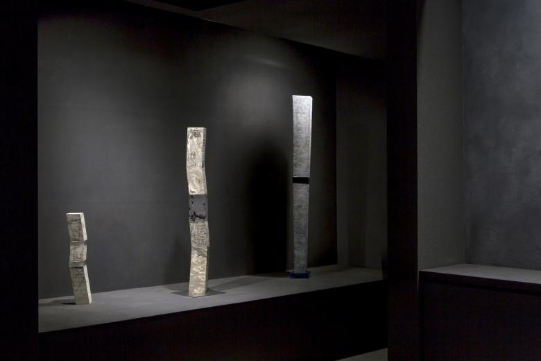 そして近藤高弘氏の技法である銀滴彩をあしらった横幅7mを超える平面作品を空間のメインに据えた。暗がりの中でこの銀の滴りが浮かびあがることで、この地の水に纏わる流れ、滴、潤いや艶などを陶器の世界の中で感じてもらうことを目指した。