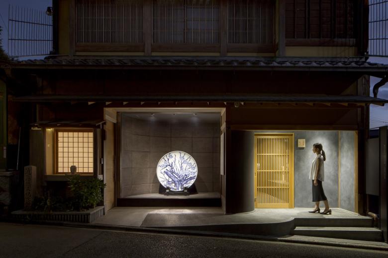 ① これまで広く公開されていなかった悠三氏の最大級の作品である梅染付大皿を茶わん坂の通りから誰でも見ることができるエントランススペース。