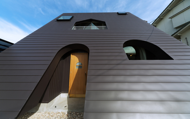道に面する壁を斜めに倒すことで、通行者からの視線を遮り、室内の家族の視線は上部の空へと向けることができる。さらに、斜めの壁に設けられた開口部からは、十分な採光がとれるようになった。1層目にはアーチ型、2層目には家型、3層目には四角型の開口部をもつ内部では、それぞれの層ごとに異なった風景への見え方を作り出している。