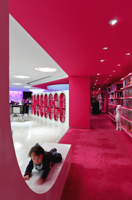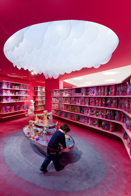 Visitors are enveloped by the curvaceous, pearlescent surfaces of the lobby, leading to a pink escalator tube that takes them from the bustle of the street, to the double-height main floor. A three-story spiral staircase enclosed by eight hundred Barbie dolls is the store’s core; everything literally revolves around Barbie.