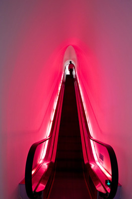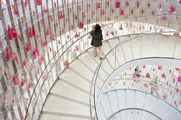 The staircase links the three retail floors: The women’s floor (women’s fashion, couture, cosmetics and accessories), the doll floor (dolls, designer doll gallery, doll accessories, books), and the girl’s floor (girls fashion, shoes and accessories). The Barbie Café, also designed by Slade Architecture, is on the top floor.
