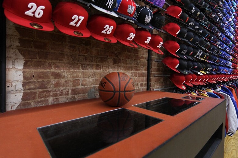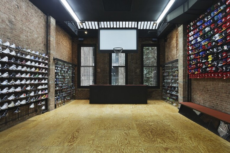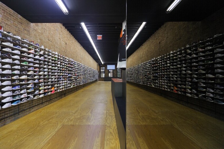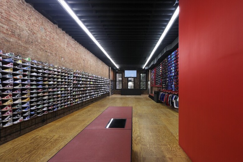 We wanted to use materials as efficiently and simply as possible. Using the existing infrastructure as the backdrop was a great starting point. The other given material was the product. Sneakers, t-shirts and hats are inherently colorful and tactile. We used these as the foreground in the space. They are treated almost as architectural elements. The wall of sneakers comes right out to the street creating a perspective of color from the front to the back. The façade was designed to become an absence of façade presenting the product almost immediately to the street. Two large glass pivot doors define the exterior enclosure which is recessed back from the street to create an open frame between interior and exterior spaces. Because the doors are full width the entire opening can literally be open in good weather.