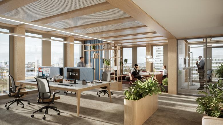 Der achtgeschossige Büroneubau, dessen Holzkonstruktion oberirdisch nur an wenigen Stellen durch Stahl und Beton ausgesteift wird, verfügt über ein offen gehaltenes, einladendes Foyer, Gastronomie- und Gewerbeeinheiten im Erdgeschoss und flexibel gestaltbare Büroflächen.