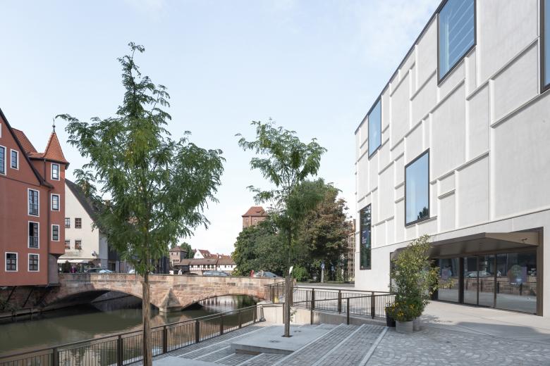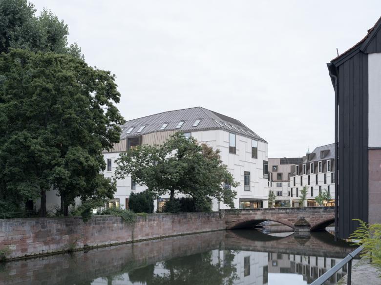 Das 5000 qm große Baugrundstück liegt malerisch an der Pegnitz, in Sichtweite des Nürnberger Altstadtmarktes. Die städtebauliche Figur der Bebauung wurde aus dem Maßstab der historischen Innenstadt entwickelt. Sie vervollständigt die angrenzenden Altstadtblöcke und lässt zwischen ihnen einen langgestreckten, leicht geschwungenen Hofraum entstehen, der vom Markt aus über ein breites Tor betreten werden kann und sich zum Ufer der Pegnitz hin öffnet. Nicht nur Passanten profitieren von dieser räumlichen Geste, sondern auch beinahe alle Nutzer des neuen Gebäudes. Die öffentliche Verbindung zur Pegnitz und zur Karlsbrücke erweitert das Wegenetz der Stadt und schafft eine ringförmige Verbindung zwischen der nördlichen und der südlichen Altstadtseite der Pegnitz.