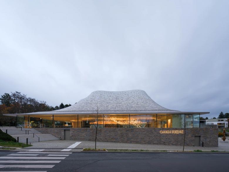 Eine breite, gläserne Fuge trennt das Dach des Konzertsaals vom steinernen Sockel und gibt dem Saalbau eine pavillonartige Leichtigkeit, die besonders von der höher gelegenen Parkseite die Erscheinung des Gebäudes prägt. Von dort gelangt man direkt in das obere Foyer des Kammermusiksaals, das den in der Mitte gelegenen Saal umfließt und allseitig Einblicke in den Saal freigibt. Die transparente Fuge öffnet den Saal zur Umgebung und zur angrenzenden Landschaft und wirkt wie ein Signet für den ambitionierten kulturellen und gesellschaftlichen Ansatz der Kronberg Academy.