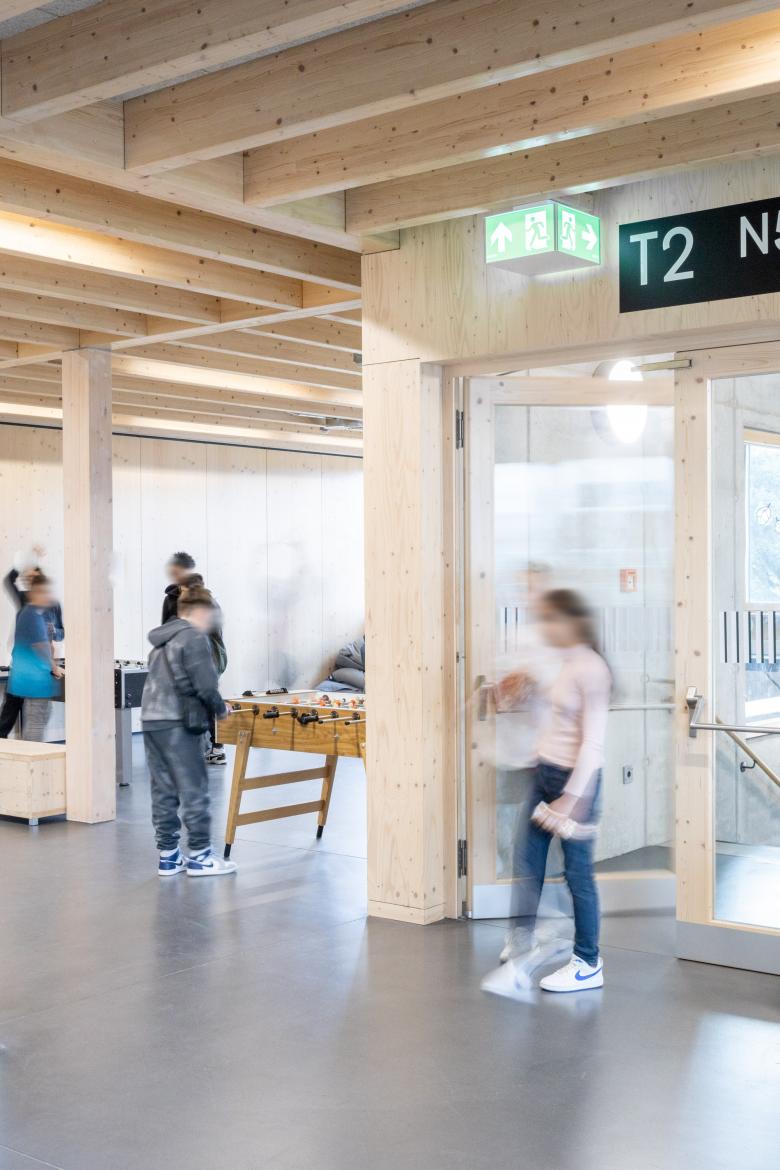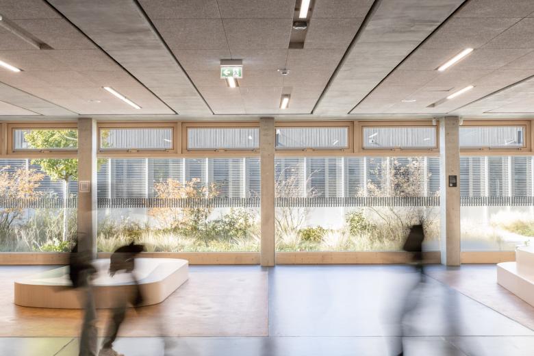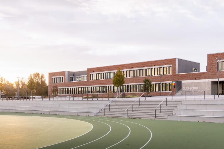 Die musikbetonte Clayschule ist eine von drei Pilotschulen Berlins, in der exemplarisch neue räumlich-didaktische Konzepte und nachhaltige bauliche Lösungen erprobt werden. Das Gebäude unterstützt mit einer Mischung aus klar zugewiesenen Bereichen und einer flexiblen Raumstruktur das innovative Schulkonzept und erlaubt ihm, über die Jahre lernfähig zu bleiben. In einem heterogenen Umfeld aus Gewerbezonen und unterschiedlich verdichteten Wohngebieten behauptet sich die Schule als kräftiger Solitär. In den Baukörper sind drei großzügige Lichthöfe eingeschnitten, die das Gebäude strukturieren und belichten. Im Erdgeschoss befinden sich die gemeinsam genutzten Bereiche der Schule wie die Aula, die Mensa, der Ganztagsbereich und die Fachklassen. Eine innere Schulstraße verbindet alle Gemeinschaftsbereiche und leitet die Schüler über verglaste Treppenräume in die Lern-Cluster im Obergeschoss. Die jahrgangsweise organisierten Bereiche begleiten die Schüler über die gesamte Schulzeit und werden durch große Lernterrassen gegliedert und aufeinander bezogen. In der umlaufenden Klinkerfassade bilden tiefliegende Fensterbänder die inneren Funktionen ab. Die eingeschnittenen Terrassen und Innenhöfe erhalten leichte Pfosten-Riegel-Fassaden aus Holz und Glas, die den Charakter der Lernbereiche bestimmen. Alle Materialien zeichnen sich durch eine große Robustheit, ein gutes Alterungsvermögen und einen geringen Wartungsbedarf aus.