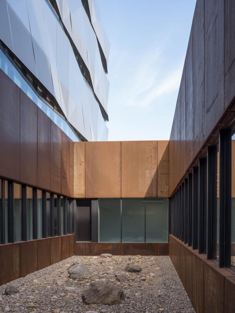 Der Erweiterungsbau des Zentrums für Ozeanforschung entstand am Mündungsbereich der Schwentine an der Kieler Förde. Mit einem Sockel aus Cortenstahl, der die bauliche Kante des bestehenden Gebäudes fortsetzt, integriert er sich in die von Ziegelbauten geprägte Umgebung. Der Sockel nimmt die Lager für Expeditionsgeräte und Labore auf und wird durch Patios gegliedert. Darüber erheben sich fünf Kuben unterschiedlicher Proportion und Höhe für die Forschungsbereiche, die mit einer prismatisch reflektierenden Glas-Alufassade dem Gebäude eine gewisse Leichtigkeit geben. Aus dem Zusammenspiel zwischen dem hermetischen, mit der Umgebung korrespondierenden Sockel und den Glaskörpern, in denen sich die maritime Lichtstimmung des Ortes fängt, entwickelt sich das architektonische Thema des Hauses. Eine Sonderstellung nimmt der Kubus für die öffentlich zugänglichen Bereiche mit Bibliothek und Konferenzbereich ein, der ebenfalls mit Cortenstahl verkleidet ist. Um den alltäglichen Austausch der Wissenschaftler zu fördern, werden an den Fluren informelle Aufenthaltsbereiche und Besprechungsräume mit Blick auf das Wasser und die institutseigenen Forschungsschiffe angeboten.
