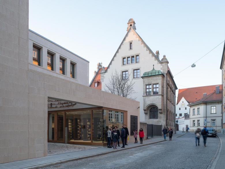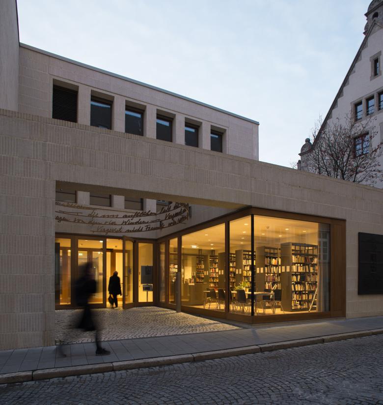 Um den noch erhaltenen Bestandsbau des Gemeindezentrums mit dem Neubau zu verbinden, wurden die Synagoge und das neue Gemeindezentrum unter einem Dach zusammengefasst und über einen großen Innenhof auf den Altbau bezogen. Das gestaffelte Volumen knüpft mit seiner diffenzierten Dachlandschaft an die niedrigen trauf- und giebelständigen Häuser der denkmalgeschützten Altstadt an. Seine massiven, hell geschlämmten Ziegelmauern wurden farblich auf die Putzfassade des Altbaus abgestimmt und über großzügige Verglasungen und mehrere Höfe zur Umgebung geöffnet. Ein kleiner öffentlichen Vorhof lädt Besucher in die Bibliothek ein, ohne die Zugangskontrollen im Foyer zu durch-laufen. Damit löst der Neubau zwei scheinbare Widersprüchen, die mit der Bauaufgabe verknüpft zu sein schienen: sich in zeitgemäßer Architektursprache in die 2006 zum UNESCO-Welterbe ernannte Altstadt einzufügen und ein offenes und gleichzeitig gesichertes Haus für das jüdische Gemeindeleben entstehen zu lassen.