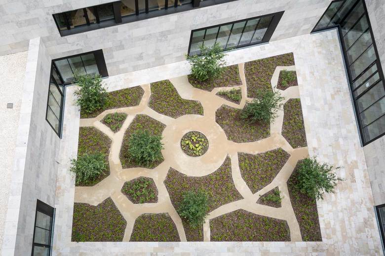Aus einem erdgeschossigen Sockel, der alle Teile des Gebäudes über einen Kreuzgang zusammenbindet, werden für die unterschiedlichen Institutsbereiche mehrgeschossige Baukörper entwickelt. Die Anordnung und Orientierung dieser Baukörper richtet sich nach den funktionalen und räumlichen Anforderungen der verschiedenen Funktionsbereiche. So riegelt das Freihandmagazin gleichsam als Lärmschutzwand den Blockinnenbereich von der viel befahrenen Hansaallee ab. Die dazu gehörigen Büroarbeitsplätze sind in den ruhigen Innenhof orientiert. Die Projektbüros liegen zum Park nach Süden ausgerichtet, mit Blick auf das zentrale Gebäude der IG Farben. Der Wohnbereich liegt in der nordwestlichen Ecke des Grundstückes, und orientiert sich mit seinen Wohnräumen ebenfalls in den Hof.