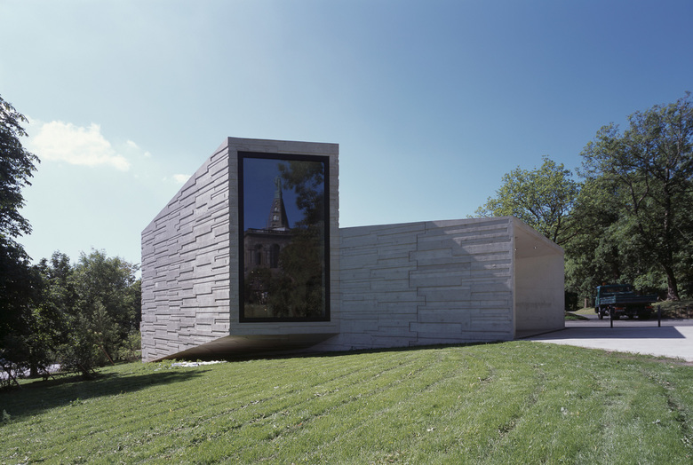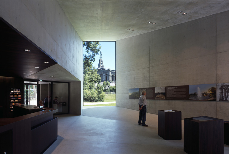Als Teil der Topografie besteht das Gebäude innen wie außen aus Sichtbeton. Dieses Material bestimmt auch die von allen Aufbau- ten freigehaltene Dachaufsicht, die vom Herkulesdenkmal einsichtig ist. Die Außenhaut nimmt mit ihrer groben Reliefstruktur das poröse Felsgestein des Herkulesbauwerkes und der natürlichen Umgebung auf, während im Inneren des Gebäudes der Sichtbeton eine weiche und glatte Oberfläche erhält.