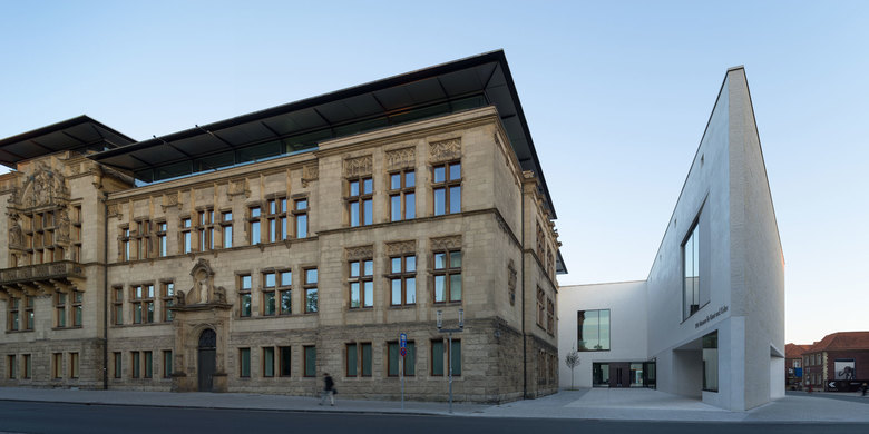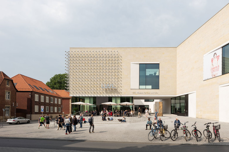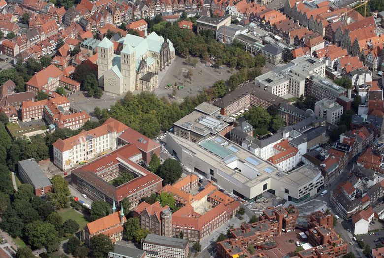 Der Neubau des Museum schließt an den Neorenaissance-Altbau am Domplatz an und ist in die öffentliche Wege der Stadt vernetzt. Um die Grenzen zwischen Stadt und Museum fließend ineinander übergehen zu lassen, wurde eine Sequenz von vier öffentlichen Räumen entwickelt, welche in ihrem Charakter zwischen Vorplatz, Eingangshof, Patio und überdachtem Foyerraum variieren. Entsprechend der städtebaulichen Zielsetzung sind die öffentlichen Funktionen wie Gastronomie, Buchladen, Bibliothek, Vortrags- und Veranstaltungsbereich und Westfälischer Kunstverein im Erdgeschoss organisiert. Im Inneren galt es ein Erschließungssystem zu entwickeln, welches den historischen Altbau sinnfällig und niveaugleich in den chronologischen Rundgang mit einschließt und die separate Erschließung des Wechselausstellungsbereichs ermöglicht. Mit unterschiedlichen Raumproportionen entstehen abwechslungsreiche Raumsequenzen, die durch definierte Ausblickräume auf städtische und innenräumliche Situationen, rhythmisiert werden.