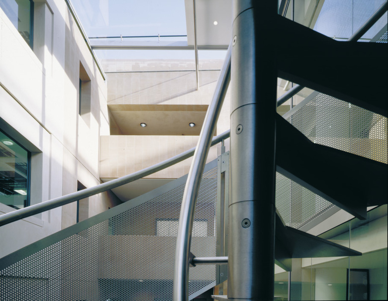 Glass, metal and stone were used to extend and complement the terracotta facades to produce a sensitive contemporary design that gained support from the planners. Two interlocking L-shaped forms were created, one solid in appearance and the other glazed and transparent. Natural light was captured with a 30 metre long glass-roofed atrium built between the two forms, to create an inspiring work space.A solid projecting canopy created a roof terrace and reduced midday glare in the atrium. Delicate steel and glass bridges and spiral stairs were introduced to animate the space.