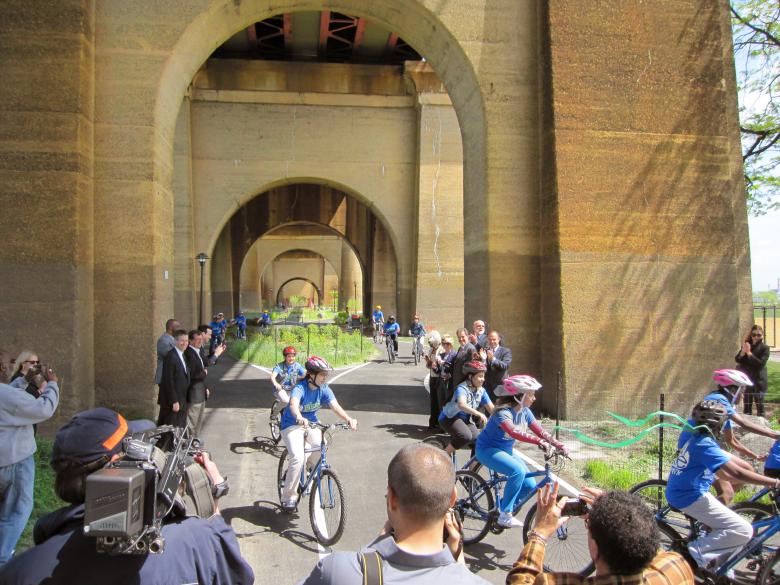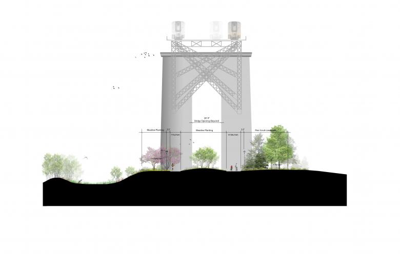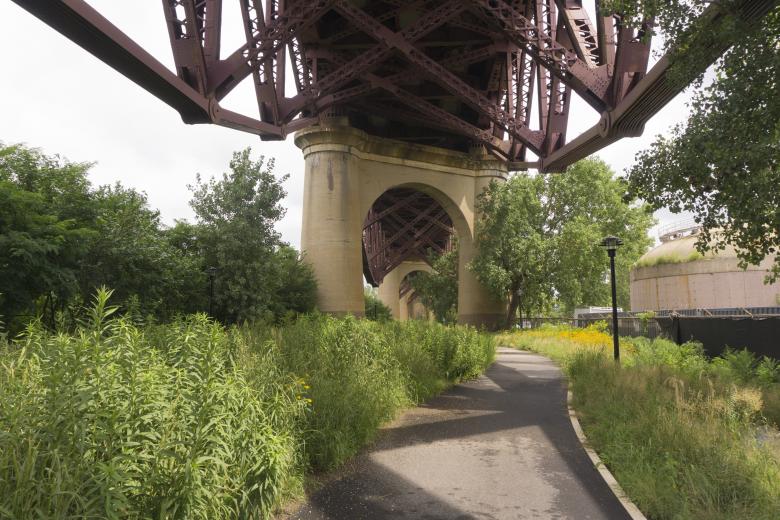 Threading under the strong sweep of the Hell Gate Bridge, the pedestrian and cycling pathway provides Randall’s Island with a circulation spine that connects recreational uses on the island and celebrates the industrial scale of the site. The beauty of the viaduct structure –its strong, tall arches– lends to a majestic pathway experience. The route celebrates infrastructure, running under the Amtrak trestle, passing by the FDNY Training Center and the Wards Island Water Pollution Control Plant, and viewing out to the ramps and spans of the Triborough Bridge. Starr Whitehouse’s design creates a linear sequence of landscape experiences that captures the diverse conditions on the island: mature and emergent woodlands, successional meadows, low lying wetlands, grasslands and river edge. The succession of native plant environments adds a new layer of ecological and scenic value to the island’s impressive infrastructure and redeveloped recreational facilities.
