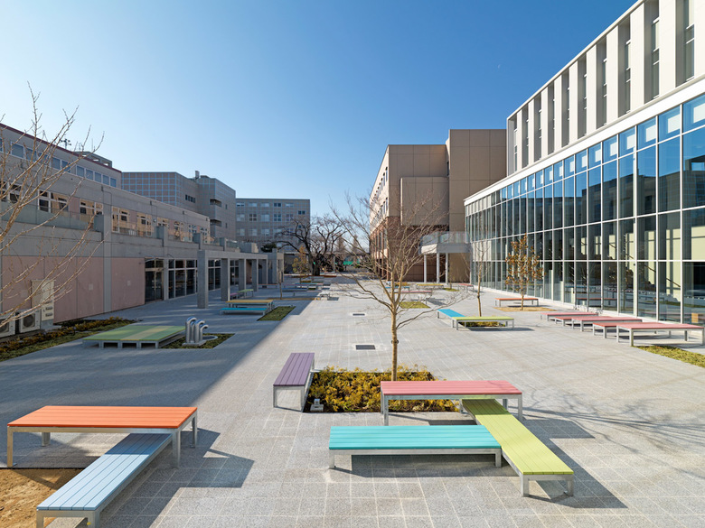 We have dotted the open area with trees that create shade and colorful benches of varying heights. Align them, link them, stack them, the benches can be arranged to cater for various activities on campus. The students can eat, talk, read, study, or even take a nap on the benches. The colors of the benches and their applications were co-designed with the students themselves. The students learn design concepts by creating an area and then observing how their area is used by other.