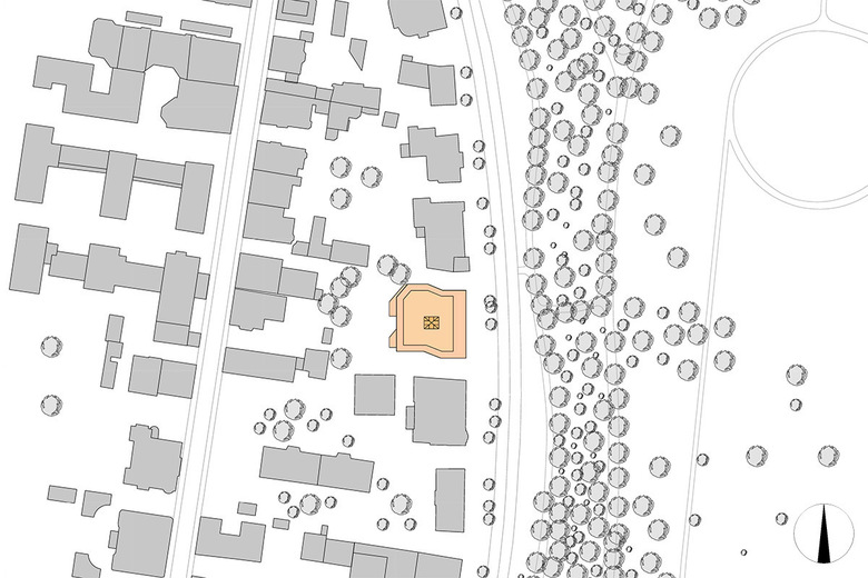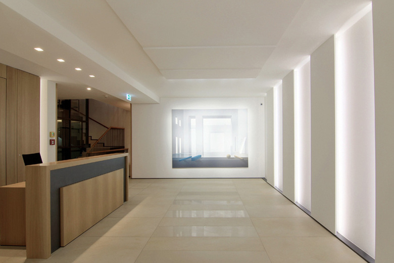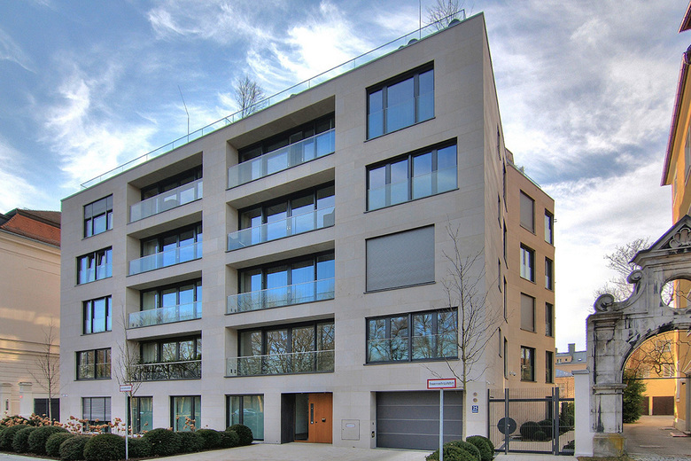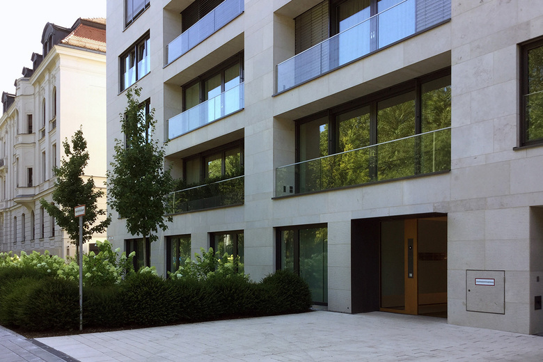 Das Wohnhaus Königinstraße 25 interpretiert den Typus des Stadtpalais' neu. Der sechsgeschossige Baukörper fügt sich als Solitär harmonisch in die denkmalgeschützte Nachbarbebauung ein und hebt sich mit schlichter Eleganz sowie einer zeitgemäßen Architektursprache von dieser ab. Im Straßengefüge zeigt sich der Neubau mit 19 Wohneinheiten mit einer geometrisch klar gegliederten Fassade aus hellem Naturstein, der durch Farbnuancen und Formatvariationen Lebendigkeit erhält. Loggien zur Königinstraße und Balkone zur Gartenseite lockern die ansonsten monolithischen, homogenen Ansichten auf. Das zentrale Treppenhaus vermittelt großzügige Eleganz durch hochwertige Materialien und ein interessantes Lichtkonzept aus indirekter Beleuchtung, Deckenstrahlern und einer zentral angeordneten Glasdachpyramide, die Tageslicht spendet.