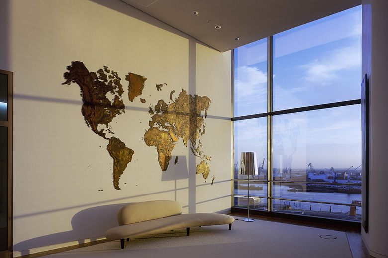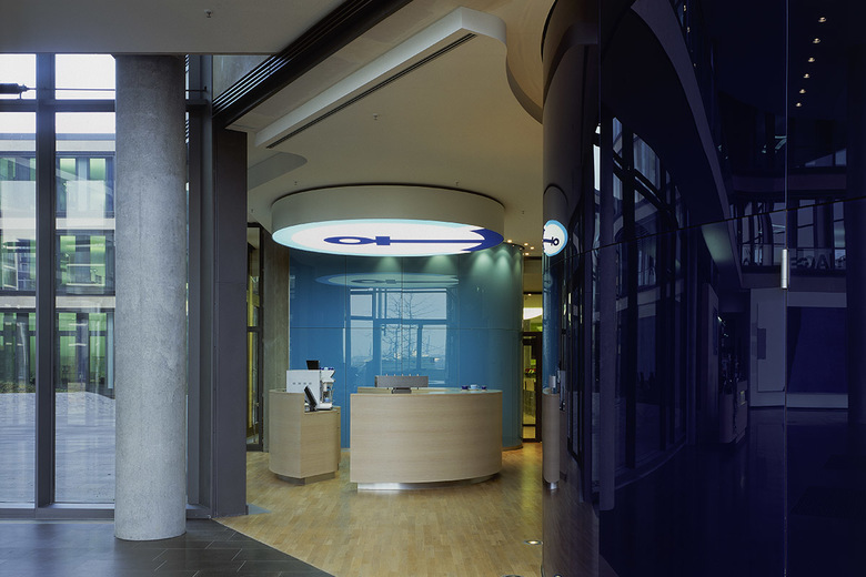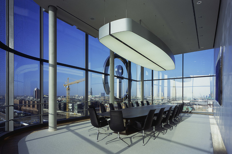 Das ausgeführte Konzept schafft attraktive Arbeitsplätze, indem es nahezu jedem Mitarbeiter den Blick auf das umgebende Wasser ermöglicht und somit die Bedeutung des Standortes verstärkt. So ist es aufgrund der großzügigen Ausführung des Foyers gelungen, selbst den im östlichen Riegel gelegenen Arbeitsplätzen einen Blick auf den Grasbrookhafen zu ermöglichen. Die einzelnen Büroetagen sind flexibel in ihrer Raumaufteilung und verstärken durch sorgsam gesetzte Akzente die Identifikation der Mitarbeiter mit ihrem Unternehmen. Durch eigens entwickelte Elemente ist ein individuelles Möblierungskonzept entstanden, das bewegliche Arbeitsflächen und kollektiv genutzte Einrichtungen beinhaltet. Das Corporate Identity wird durch das am oberen Geschoss des Turmes angebrachte, weit in die Ferne leuchtende Firmenlogo offensichtlich. Hier befinden sich die Konferenzräume des Unternehmens, die einen überwältigenden Ausblick ermöglichen. Die riesigen Panoramafenster des großen Konferenzbereiches geben den Blick auf das gesamte Hafengebiet und die offene Elbe bis hin zur Köhlbrandbrücke frei. Der kleinere, auch als Lounge genutzte Konferenzraum wendet sich der Innenstadt zu und macht sich die besondere Atmosphäre des alten Hamburgs zu eigen.