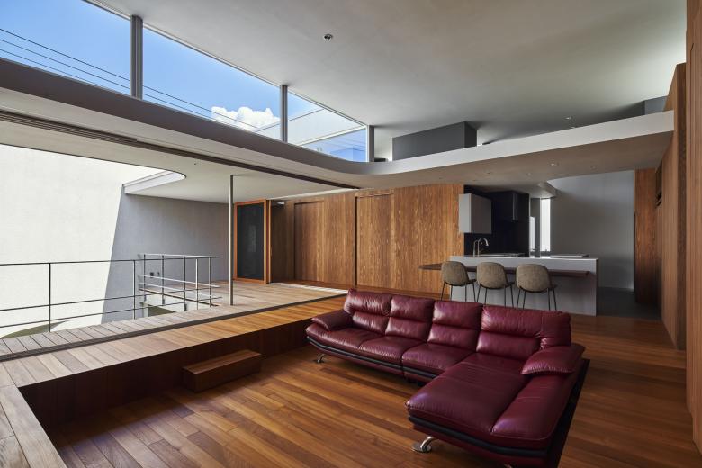 擁壁をインテリアとして取り込み、まるで地中にいるような感覚になる1階。浮き壁と堀り込まれた1階を眺めると、まるで浮遊してるような2階は空をより近くに感じられる。