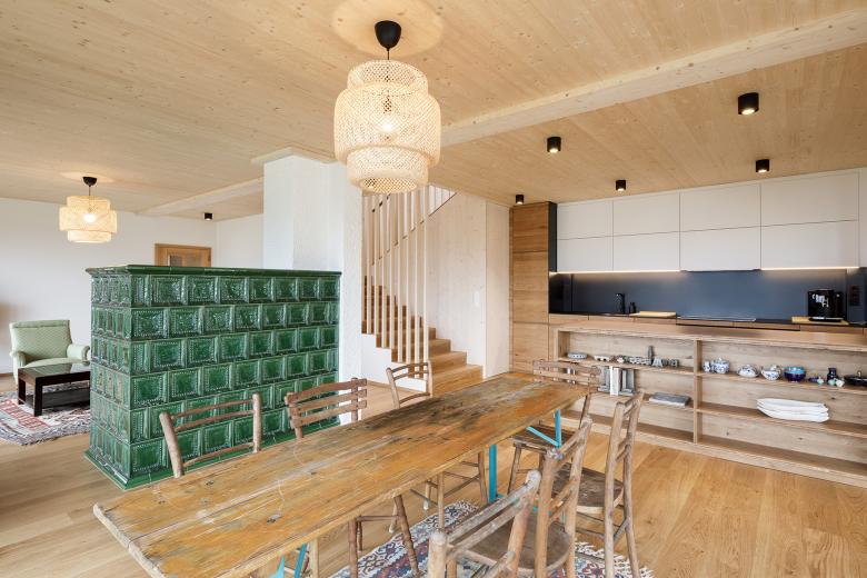Sie ist nicht immer ganz einfach, diese Gratwanderung einer Weiterentwicklung von Tradition und Moderne. Obwohl das gesamte Gebäude aus Holz errichtet wurde, wurde die bekannte Formensprache des verputzten Erdgeschoßes aufgenommen. Die 3S-Platte im EG wurden mit Weißöl behandelt, die Lärchenholzfassade im OG ist naturbelassen.
