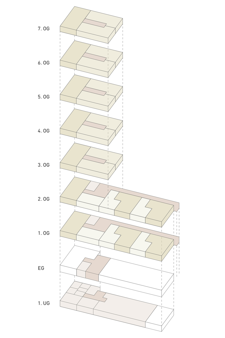 «Für Elise» ist ein bekanntes Klavierstück von Ludwig van Beethoven. Das Besondere: es ist im 3/8-Takt notiert. Unser Projekt erweitert die Anlage im 3/8-Takt mit einem Neubau mit 3 und 8 Geschossen. Das neue Volumen spielt mit den vorhandenen Gebäuden und den Strukturen. Es ordnet sich dem orthogonalen Muster unter, variiert jedoch seine Gebäudehöhe. Die acht Geschosse an der Pestalozzistrasse bilden einen neuen, gut erkennbaren Zugang zur Siedlung. Das Volumen markiert die gewünschte Präsenz im Quartier. Im Innern der Siedlung nimmt die Dreigeschossigkeit den Massstab der Nachbarhäuser auf. Das Neubauvolumen tritt so in Dialog mit den bestehenden Bauten.