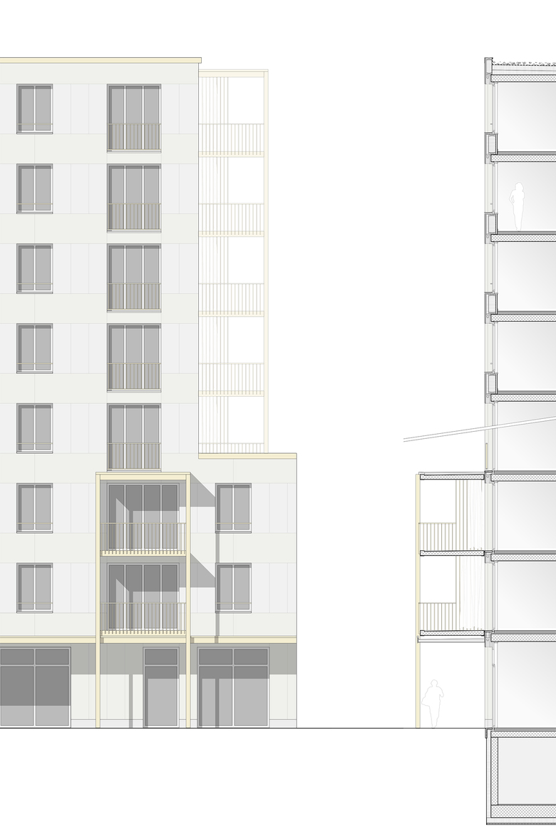 Sämtliche Wohnungen sind über einen einzigen, grosszügigen Eingang erschlossen. Adresse und Haupteingang liegen auf der Westseite, ein Zu- und Ausgang auf der Ostseite ermöglicht die Durchlässigkeit zu den beiden Längsseiten. Die Wohnungserschliessung ist ein hybrid aus Laubengang und Punkterschliessung. Das Treppenhaus ist in den ersten drei Geschossen ein lebendiger Raum und reduziert sich ab dem vierten Geschoss zu einer effizienten Punkterschliessung. Die Reduktion auf eine gemeinsame Erschliessung für die 27 Wohnungen fördert die Begegnung und die Kommunikation untereinander. Die zwei Erschliessungstypen erzeugen zudem unterschiedliche Wohnungstypen, was die Vielfalt der Wohnungen fördert.