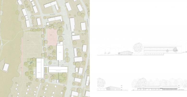 Unter dem neuen Dach erhalten die beiden unterschiedlichen Nutzungen ein eigenes Volumen. Zwischen den beiden Volumen entsteht ein Durchgang, der den Pausenplatz mit dem Wald und den Kindergartenaussenräumen verbindet. Die Lage des Neubaus ermöglicht eine klare Orientierung des Mehrzweckraums auf dem Pausenplatz. Am Rand vom Pausenplatz, nach der neuen gedeckten Verbindung, erhält der Kindergarten eine eigenständige Adresse.