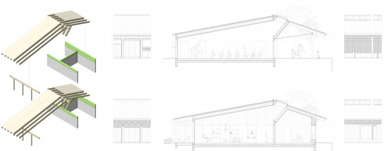 Der entwickelte Schnitt lässt sich bei allen Nutzungen anwenden und sorgt für ein identitätsstiftendes Raumerlebnis. Drei Holzelementplatten bilden das Dach, welches auf der massiven Raumschicht und auf Holzstützen steht. Die Platten werden an den Anschlusspunkten miteinander verbunden. Die Zugkräfte werden beim Massivteil von Betonkränzen und im Bereich Aussenraum Mehrzweckraum von Zugbändern aufgenommen. Die Haupträume werden über ein Dach-Lichtband zusätzlich belichtet.
