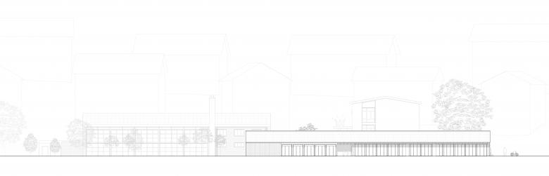Um der Kraft und Eleganz der Bestandesbauten ein Gegenüber zu stellen, werden der Mehrzweckraum und die Kindergartennutzung unter einem durchlaufenden Satteldach platziert. In der Grundrissproportion lehnt sich der Neubau seinen Vorgängern an, in der Geschossigkeit bleibt er jedoch klar untergeordnet. Die volumetrische Komposition bildet ein stimmiges Ensemble.