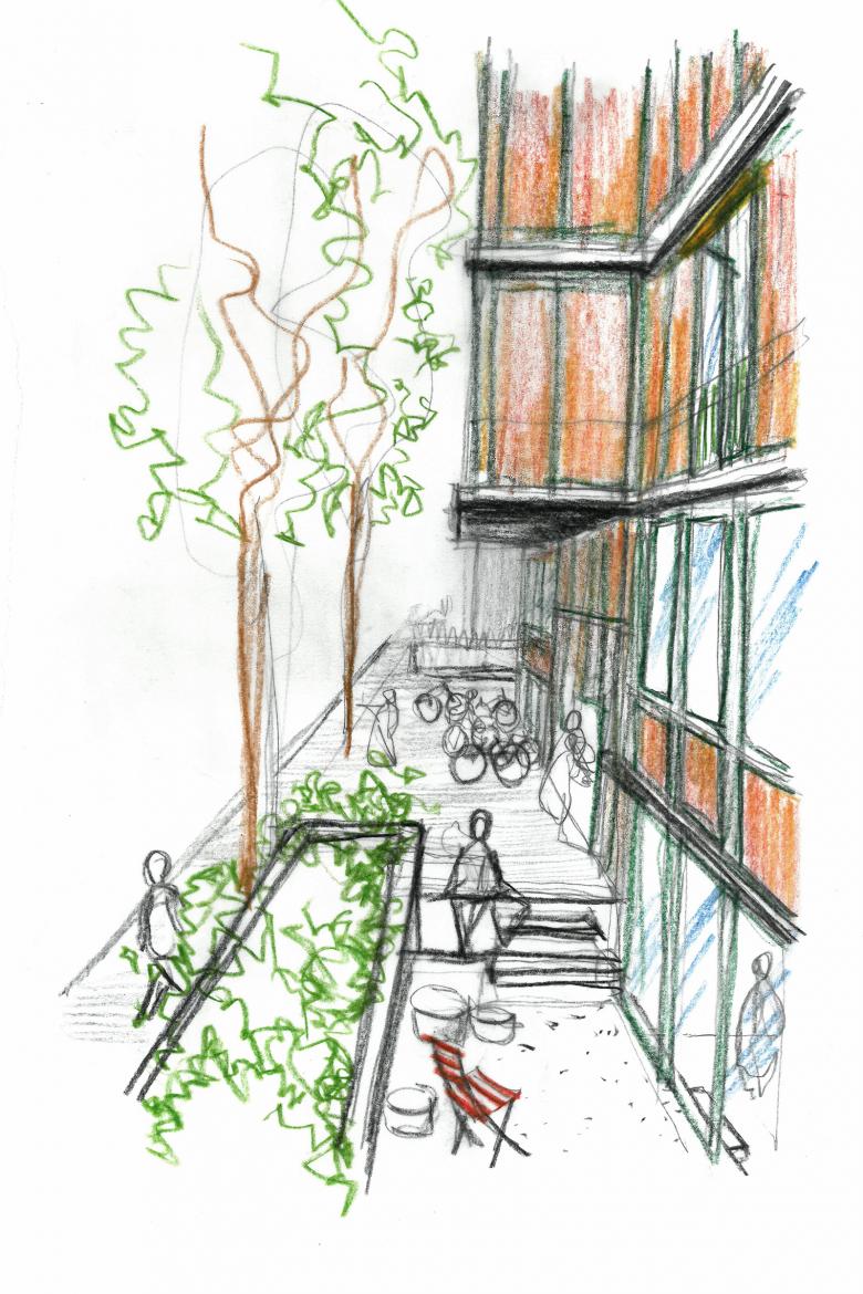 Das Erdgeschoss liegt rund ein Meter unter Strassenniveau. An der Zähringerstrasse und am Magazinweg werden zwei Bereiche mit einem vorgartenähnlichen Grünraum vom Strassenraum abgegrenzt. Diese Bereiche bilden eine geschützte Vorzone zu den im Erdgeschoss gelegenen Arbeitsräumen. Der Hauseingang wird auf Strassenniveau verortet und das öffentliche Leben bis an die Fassade gezogen. Zur Zähringerstrasse entsteht auf zwei Drittel der Fassadenlänge ein Vorplatz, der das Gebäude an der Strasse verankert. Eine neue Verbindung vom Treppenhaus zum Garten und den angrenzenden Gemeinschaftsraum aktivieren den Aussenraum im Südwesten und stärken die Kontakte im Haus.