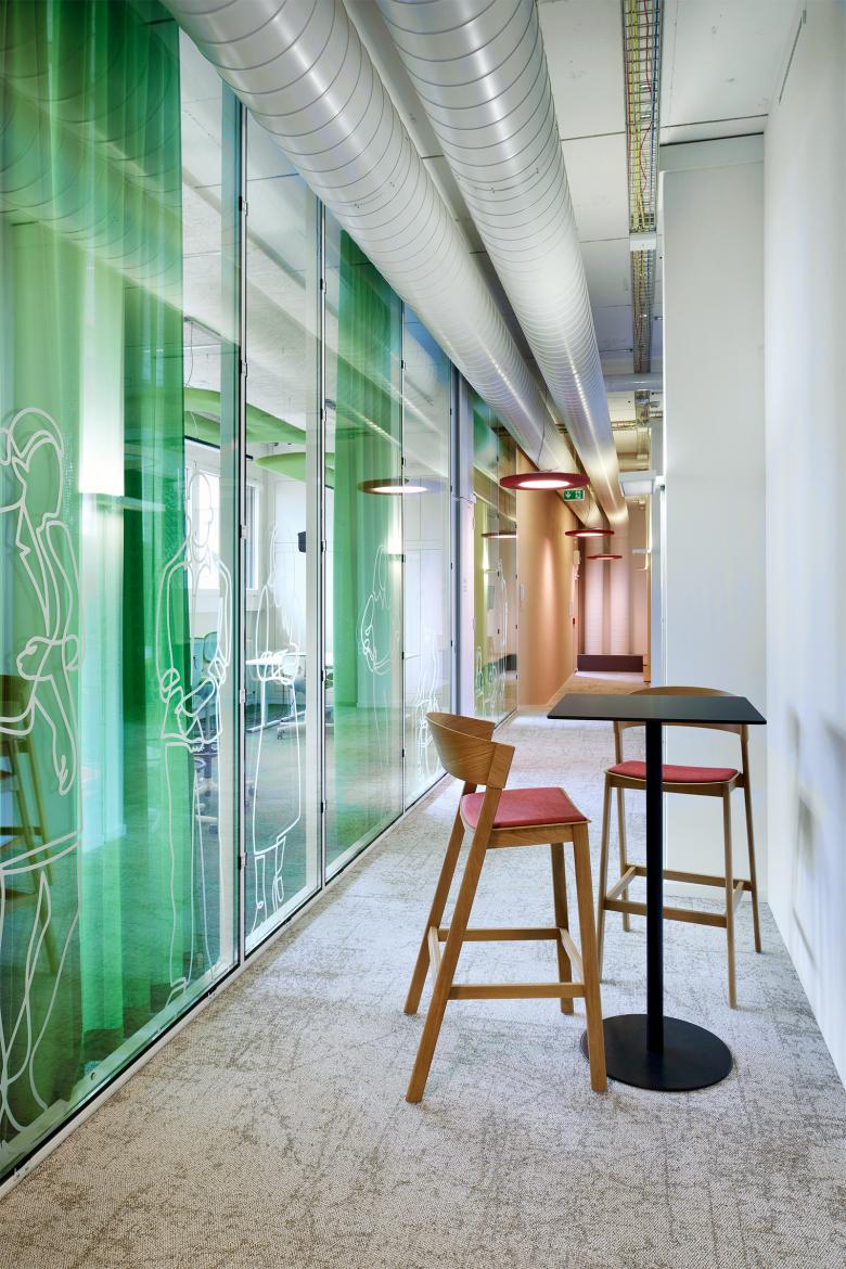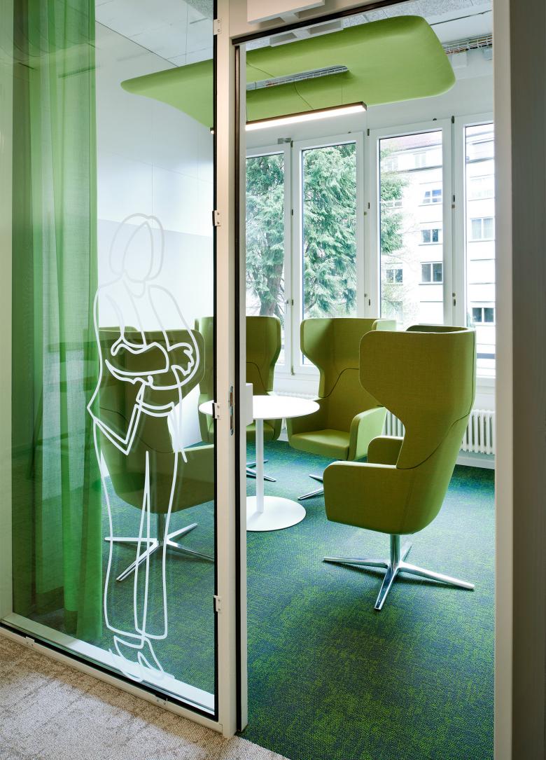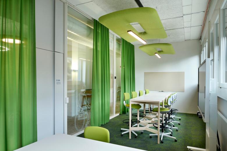 Bereits eingesetztes und bewährtes Mobiliar an bestehenden Standorten der BFH wird in das neue Möblierungskonzept eingearbeitet und mit neuen Elementen ergänzt. Farbliche Akzente brechen das Weiss auf und sorgen gleichzeitig für eine räumliche Orientierung. So sind die Projekträume die grünen, die Seminarräume die blauen Räume. Im Aufenthaltsbereich werden die Farben von allen Räumen aufgegriffen und miteinander kombiniert.