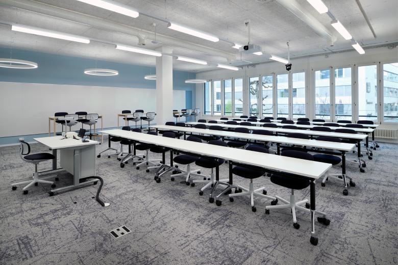 Die Dynamik des didaktischen Konzeptes des Departements Wirtschaft widerspiegelt sich in der neuen Raumstruktur. Es wurden verschieden grosse und flexible Räumlichkeiten geplant, um auf die unterschiedlichen Unterrichtsformen zu reagieren. Im hinteren Bereich sind zwei grosse, durch neue Leichtbauwände begrenzte Seminarräume angeordnet. Den vorderen Bereich bilden wir mit dem Zusammenschluss des Aufenthaltsbereiches und einem weiteren Seminarraum zu einer offenen und flexiblen Situation aus. Mittels Schallschutz-Vorhängen können die Räume zusammengelegt oder abgetrennt werden. An der Ostfassade entlang des Korridors wird die bestehende kleingliedrige Raumstruktur belassen und zu Projekträumen ausgebildet. Der Wunsch nach einer hohen Flexibilität wird durch das Mobiliar eingelöst. Die Rollen an den Stühlen, Tischen und Whiteboards sowie die Klappfunktion an den Tischen ermöglichen ein einfaches Umstellen zu verschiedenen Unterrichtssituationen.
