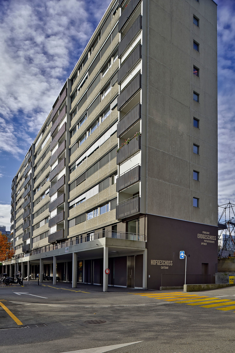 Das Scheibenhochhaus mit 54 Wohnungen an der Mühledorfstrasse bildet den nördlichen Abschluss des Fellerguts, einer Grossüberbauung aus den 1970er-Jahren. Gezielte Eingriffe in den Sockelgeschossen verändern die Orientierung des ganzen Gebäudes: aus der vernachlässigten Rückfassade wird neu eine attraktive und lebendige Zugangsfassade.