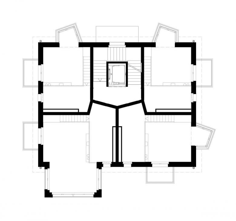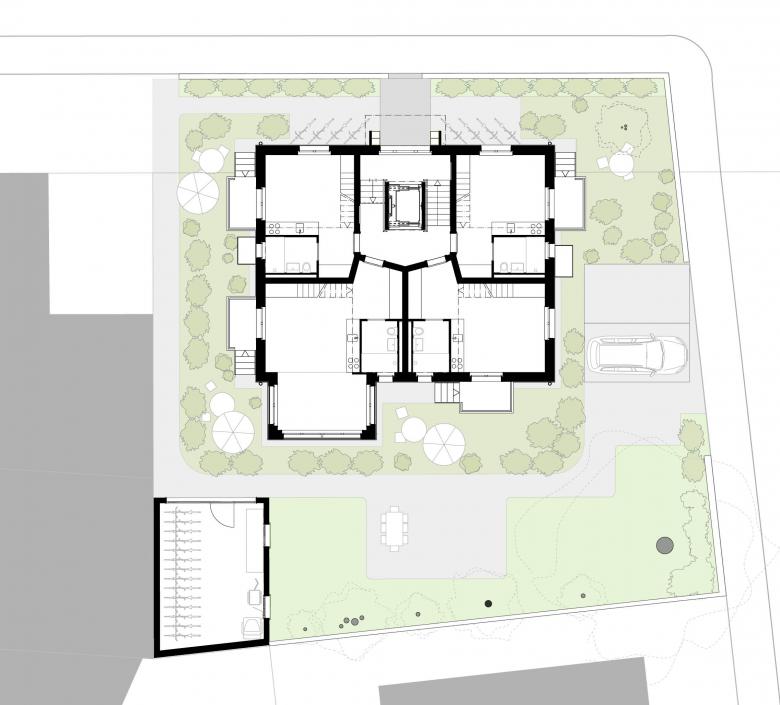 Das vorgegebene Volumen erlaubt aussergewöhnliche Raumhöhen von 3.90m, was wiederum den Einbau von Galerien in den Regelgeschossen ermöglicht. So können an der ausgeprägt städtischen Lage insgesamt 10 Micro-Appartements realisiert und eine hohe Ausnutzung des begrenzten Volumens erreicht werden. Trotz der minimalen Fläche entfalten die Wohnungen so eine räumlich spannungsvolle Wirkung. Sämtliche Wohnungen haben durch einen Balkon oder eine Dachterrasse Aussenraumbezug, die vier Wohnungen im Hochparterre gelangen zudem über den Balkon direkt in den Garten.