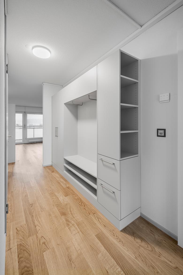 Die Kopfwohnungen im Westen erweitern wir um die bestehenden Einzimmerwohnungen, so entstanden neue grosse Familienwohnungen mit offenen Wohnküchen. Die Standardwohnungen blieben in der Anordnung unverändert, einzig die Wohnungen im Haus 13 wurden als Alterswohnungen konzipiert.