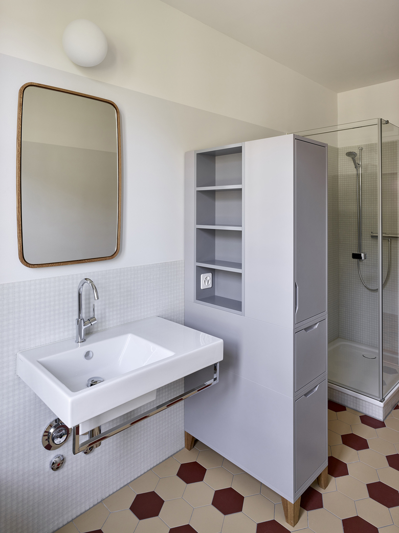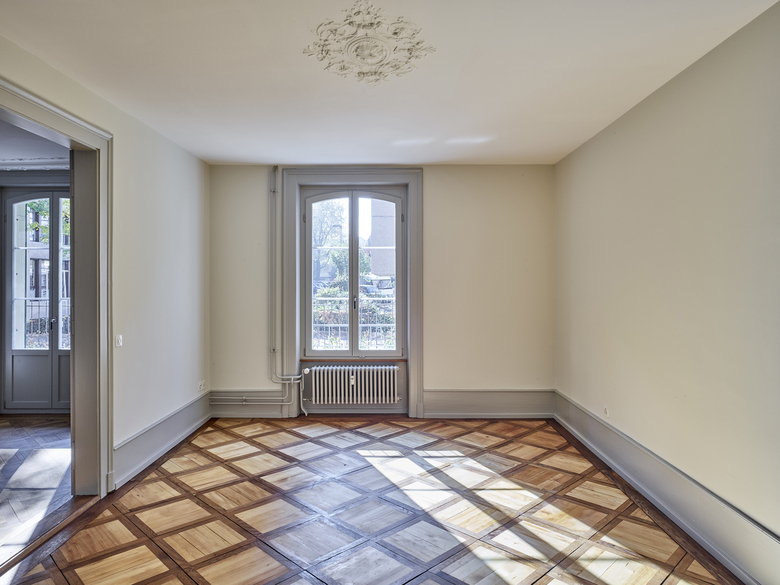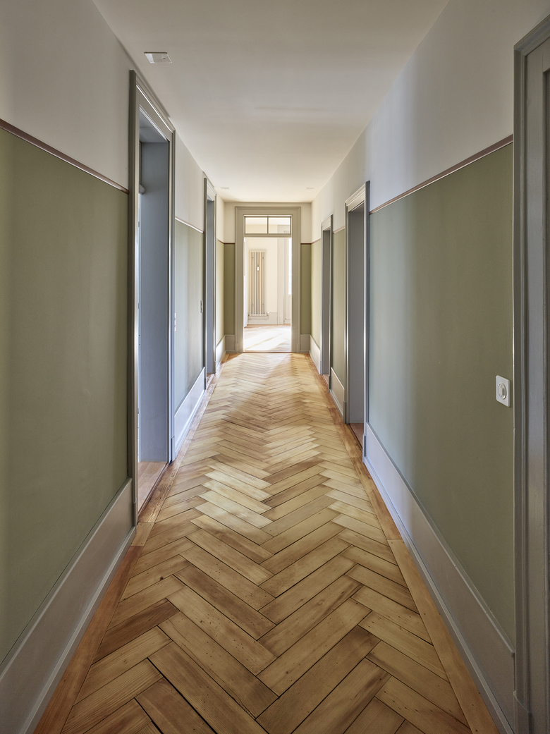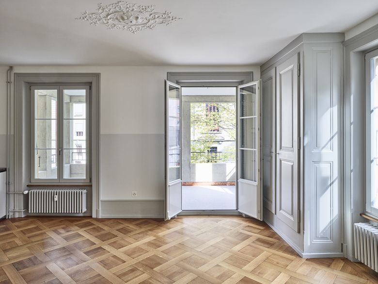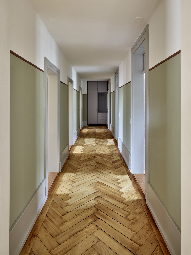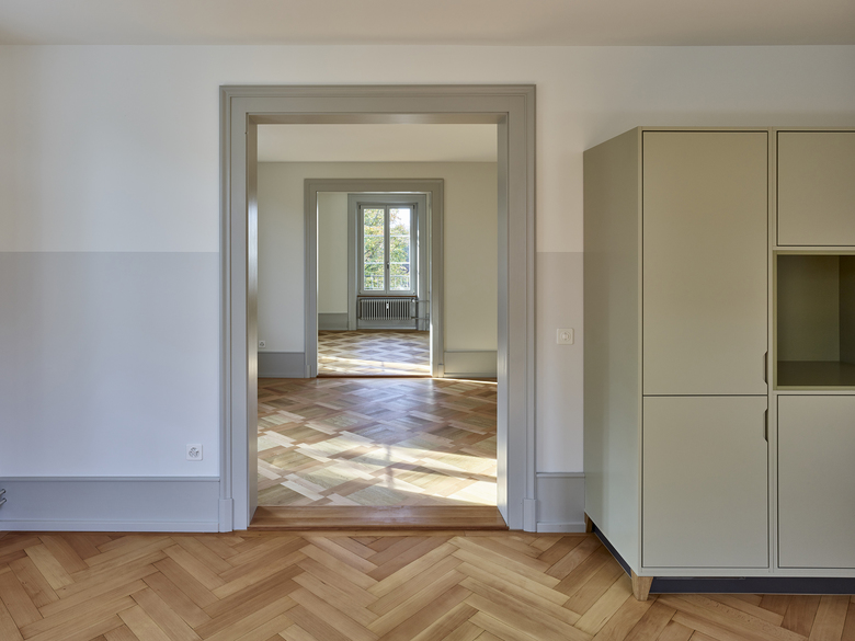 Verschiedene Holz- und Verlegearten von historischen und rekonstruierten Parkettböden und ein durchlaufender Fussladen führen zu einer atmosphärischen Raumstimmung. In Anlehnung an die teilweise vorgefundenen, sechseckigen Zementplatten wurde in den Nassräumen der neue Boden verlegt. Diverse Schichten von Tapeten zeugten wie Jahrringe von mehrfachen Sanierungen und wurden bis auf die Grundstruktur zurückgebaut. Hinter nachträglich eingebauten Schränken fanden wir aufschlussreiche Erkenntnisse zur ursprünglichen Farbigkeit. In Zusammenarbeit mit Denkmalpflege und Restaurator erstellten wir so ein durchgängiges Farbkonzept. Neue Einbauten reihen sich in diese Farbigkeit ein, heben sich aber durch ihre Gestaltung differenziert ab.
