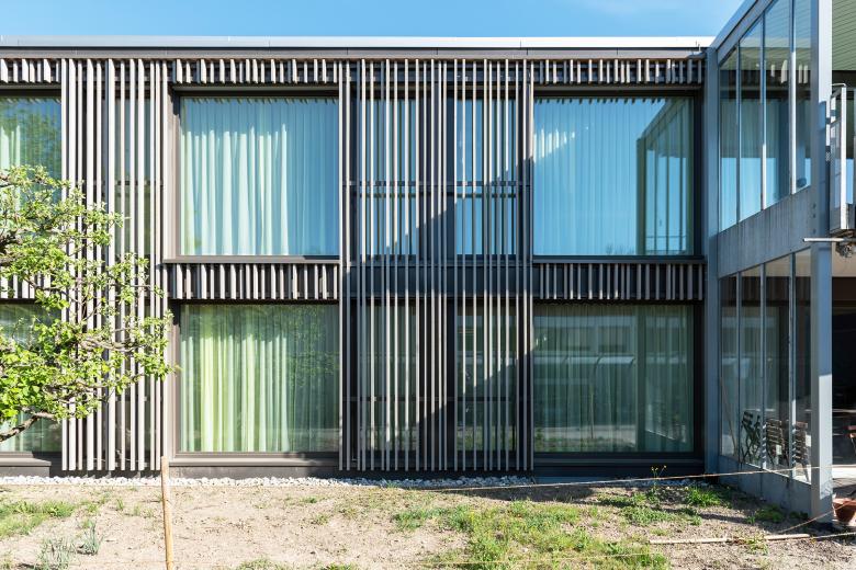 Beim Internatsbau wird die Fassade auf den Stand der aktuell geltenden Vorschriften gebracht. Die Filterschicht mit Holzlamellen vor grossflächigen Verglasungen verleiht dem Gebäude einen wohnlichen Charakter und schafft eine Verbindung zur Holzfassade des Erweiterungsbaus.