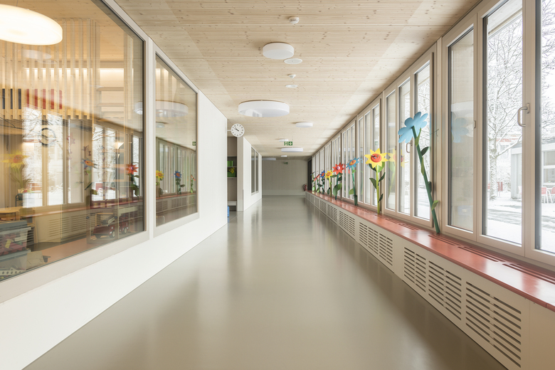 Die Räume sind geprägt durch weiss lasierte Holzwände aus Dreischichtplatten, Lignatur-Holzdecken mit Akustikfunktion sowie Kautschukböden. Verspielt angeordnete runde Lichtscheiben beleuchten die Bewegungszonen. In den Unterrichts- und Konzentrationsräumen sorgen quadratische Deckenleuchten für ein gleichmässiges Arbeitslicht. Die zurückhaltende Gestaltung bietet den Kindern eine ruhige Basis.