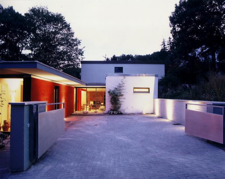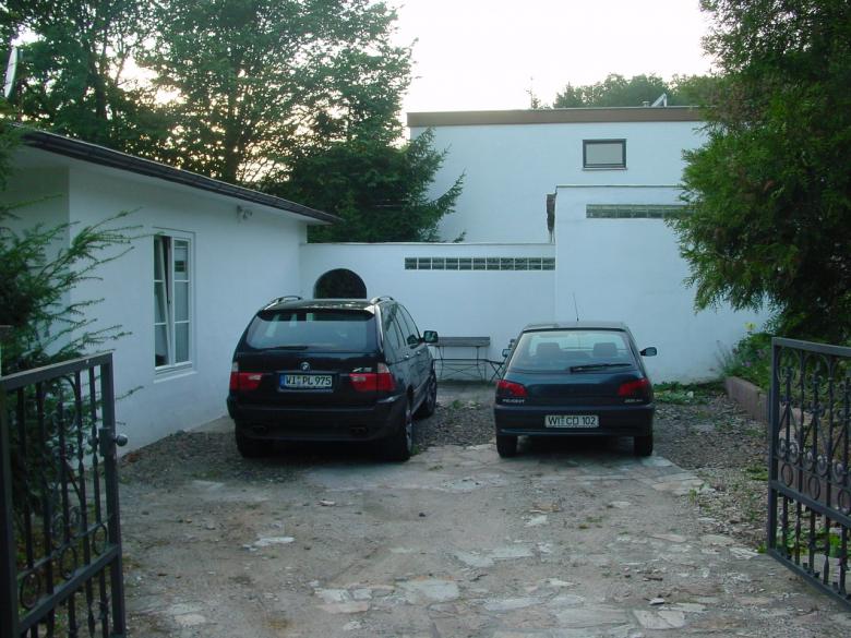 In Georgenborn lag der Fokus unseres Vorhabens darauf, die große Einfahrt zum Haupthaus durch eine behutsame Umgestaltung neu zu interpretieren – ohne das Haupthaus selbst zu verändern. Ein Nebengebäude, das ursprünglich als Garage vorgesehen war, wurde zu einem Arbeits- bzw. Gästezimmer umgestaltet. Um das Haupthaus optisch und funktional sinnvoll mit dem vorhandenen Anbau zu verknüpfen, haben wir eine Wandscheibe zwischen beide Gebäude gesetzt, die Zwischenräume verglast und ein filigranes Flachdach darüber gelegt.