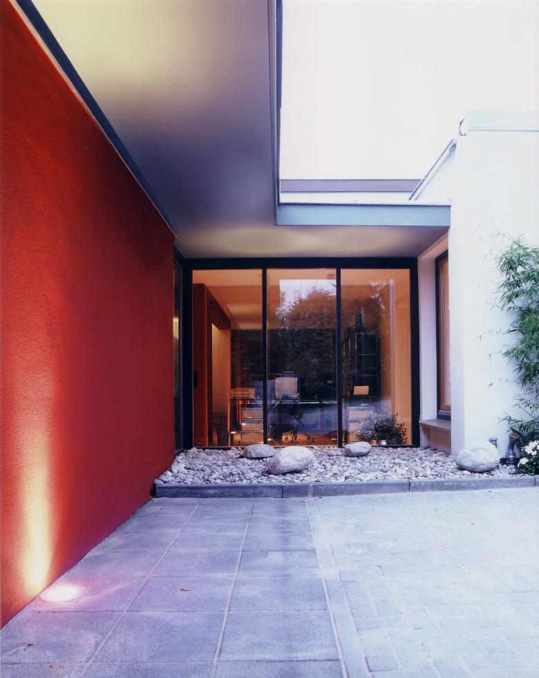 Das Resultat ist ein zeitloses Ensemble, das dezent im Hintergrund bleibt und die beiden Baukörper in den Vordergrund rückt. Die Verbindung des Ensembles wird durch eine markante rote Wandscheibe betont, die wir mit dem Bauherrn gemeinsam entschieden haben – ein klares Zeichen der Abstimmung zwischen Bestand und Erweiterung.