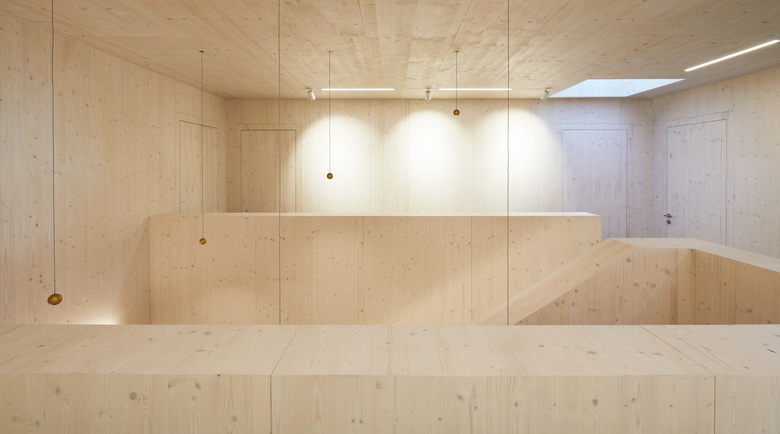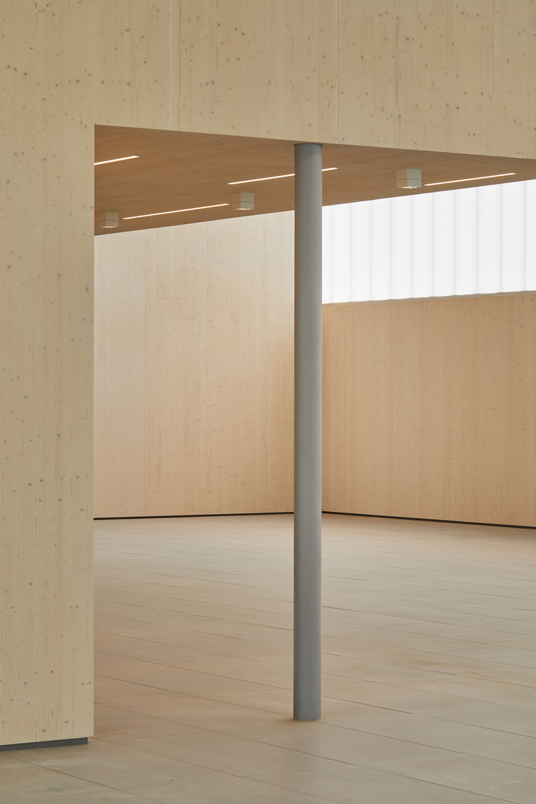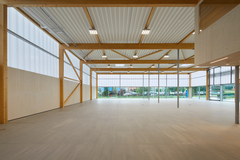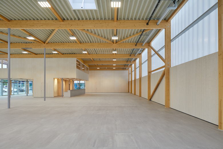 Neben der Ausstellungsfläche für die Autos wünschte der Bauherr zudem eine kleine Werkstatt, zwei Verkäuferbüros, eine Bar, einen großen Besprechungsraum und einen Raum zum Zurückziehen. Erstere wurde aus funktionalen Gründen in der südwestlichen Ecke des Gebäudes, direkt gegenüber der Werkstatt des Altbaus angeordnet. Die anderen Funktionen sind in einem ganz in Holz gehaltenen zweigeschossigen Baukörper untergebracht, der als Haus-im-Haus in die Mitte der Halle gestellt wurde. Seine Lage und seine Geometrie unterteilt die Fahrzeughalle im Zusammenspiel mit der Werkstatt in Bereiche unterschiedlicher Proportionen: mal groß und geräumig, mal klein und intim. Diese unterschiedlichen räumlichen Qualitäten ergeben eine spannungsvolle Abfolge von Räumen, welche die sinnliche Erfahrung beim Durchschreiten der neuen Fahrzeughalle bereichern. Die im Obergeschoss untergebrachten Aufenthaltsräume sind mit Fenstern zur Halle ausgestattet, welche Blickbeziehungen zwischen den verschiedenen Funktionsbereichen ermöglichen.