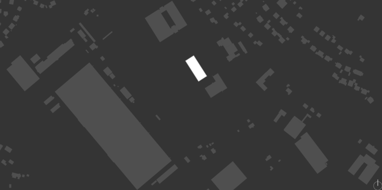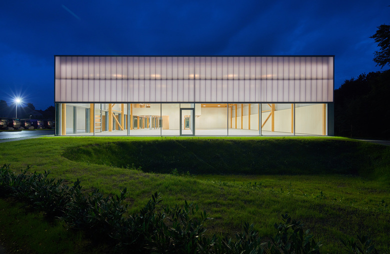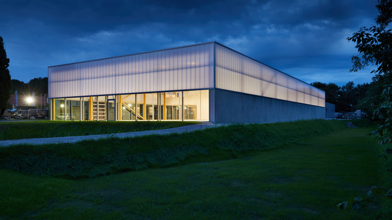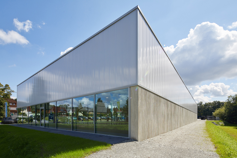 Der Neubau steht an einen kleinen Wald angrenzend im hinteren Teil des Betriebsgrundstücks. Er liegt hinter der großen Außenaufstellfläche für Fahrzeuge und fällt daher speziell in den Abendstunden nicht unmittelbar ins Auge. Um dieses Manko zu kompensieren, wurde die Fassade des Gebäudes zur Bundesstraße und zur Erschließungsstraße hin durch die Verwendung von Glas und Polycarbonat mit einer transparenten bzw. transluzenten Außenhaut ausgestattet, welche die neue Fahrzeughalle während der dunklen Tageszeiten erleuchten lässt und so die Aufmerksamkeit der Passanten weckt. Auf der Rückseite ist die untere Hälfte der Fassade mit einem strukturierten Beton verkleidet, der hier einen spannungsvollen Kontrast zur glatten Polycarbonathülle des oberen Bereichs bildet.