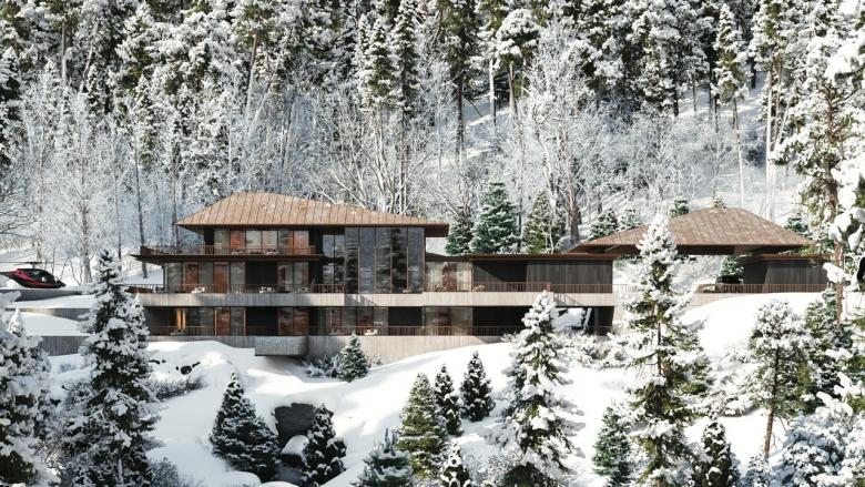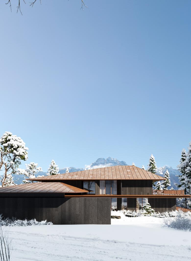 Material choices—corten steel, board-formed concrete, and charred wood—reflect the rugged local character and ensure long-term durability. A cantilevered pool and a ski-in/ski-out wing with automated slope access highlight the project's connection to outdoor living and sport.