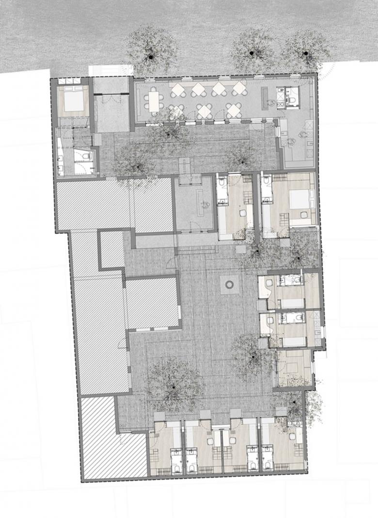 The two renovated groups of courtyard houses are located respectively on the northern and southern side of the same alley. The northern group with fifteen units develops around a series of three courtyards, while the southern group with nine units is arranged around two courtyards.