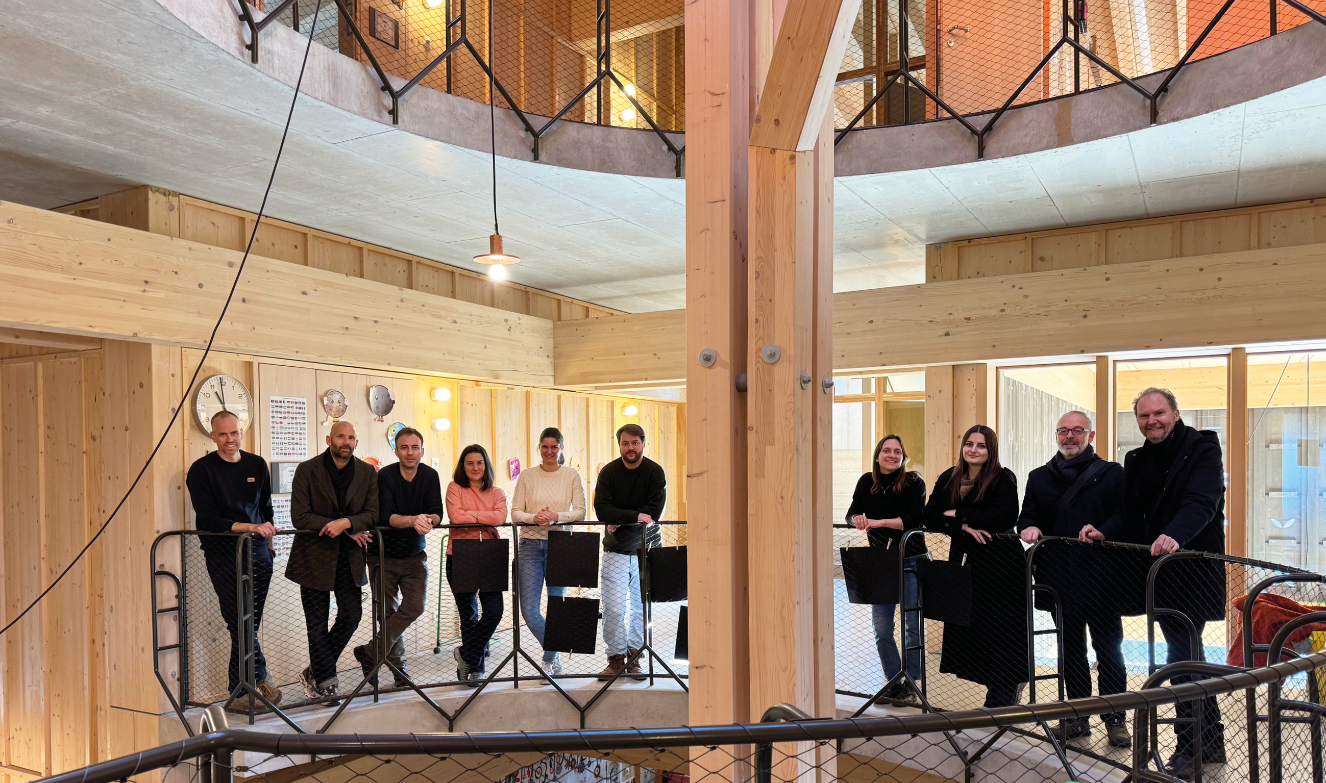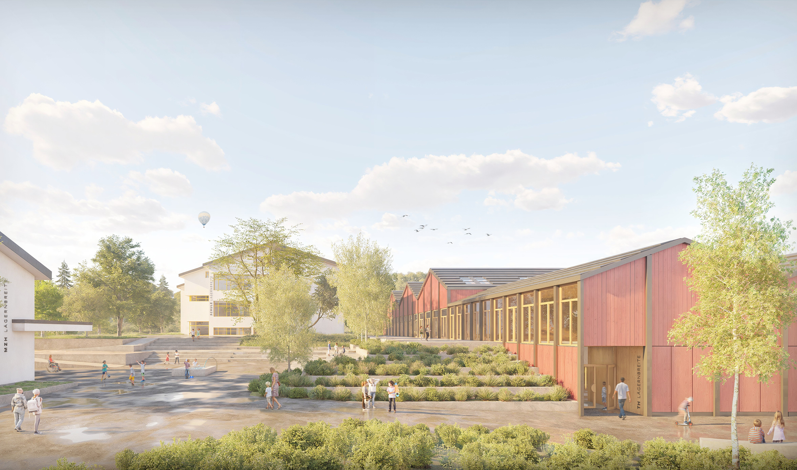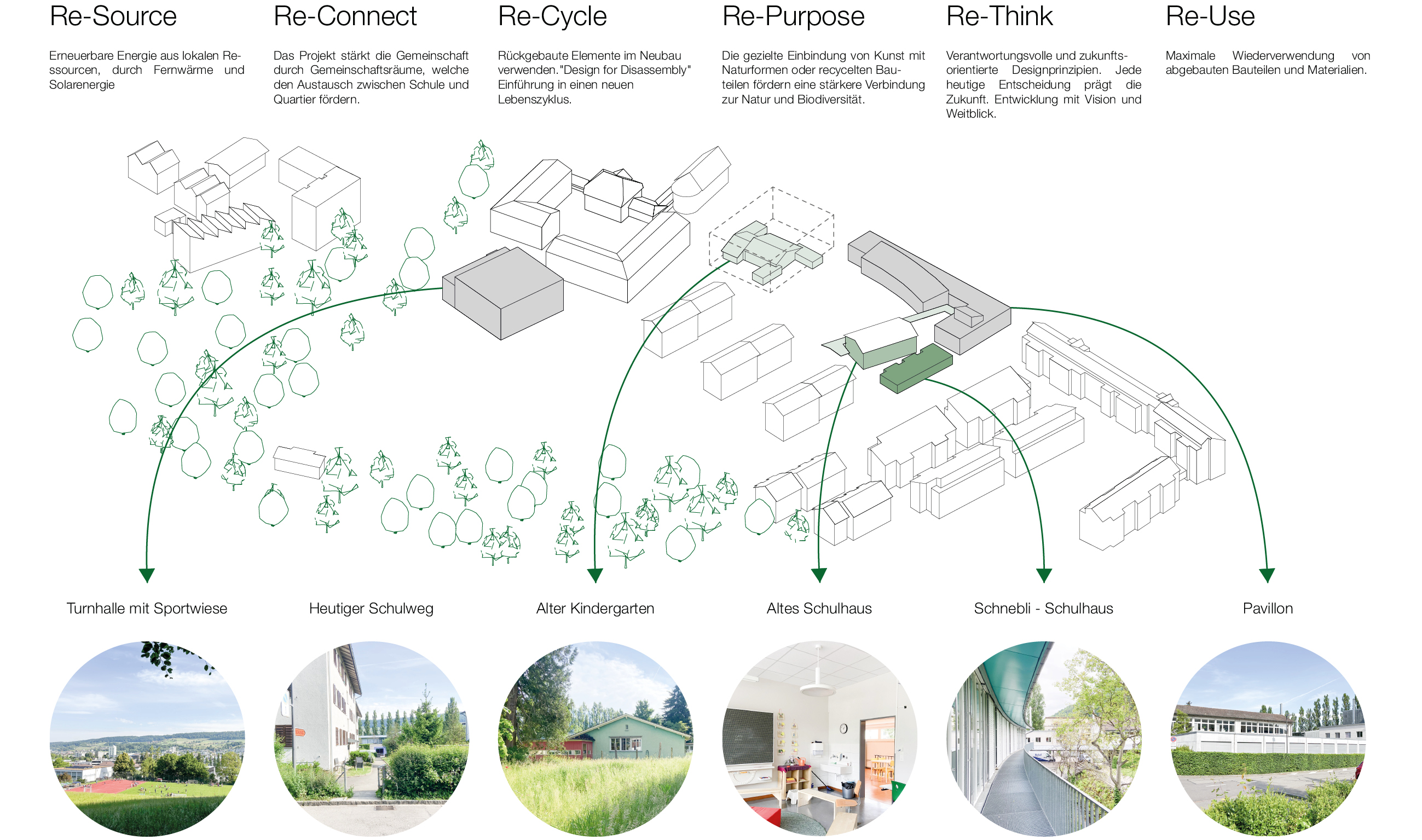 Der viergeschossige Holzbau ergänzt das Ensemble zwischen Kapelle und Schneblibau, wahrt den Baumbestand und stärkt mit klarer Setzung und einem aktivierten Freiraum die räumliche Vernetzung im Quartier. Das alte Schulhaus wird zu einem Gartenpavillon rückgebaut und als Treffpunkt für das Quartier umgenutzt. Durch «Design for Disassembly», Re-Use von Bauteilen, Low-Tech-Klimaansatz und flexible, offene Grundrisse entsteht ein zukunftsfähiges Schulareal.