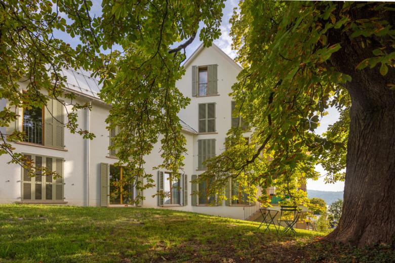 Die Topografie des abfallenden Hanges und die eindrücklichen Bäume waren wegweisend für die Setzung der zwei Häuser. Der maximale Erhalt der natürlichen Topografie, ohne Abgrabungen oder Aufschüttungen sowie der integrale Erhalt der großen Bäume führt zu einer natürlich wirkenden Anordnung der Häuser. Die Umgebungsgestaltung folgt denselben Prinzipien und integriert sich optimal in den Bestand.