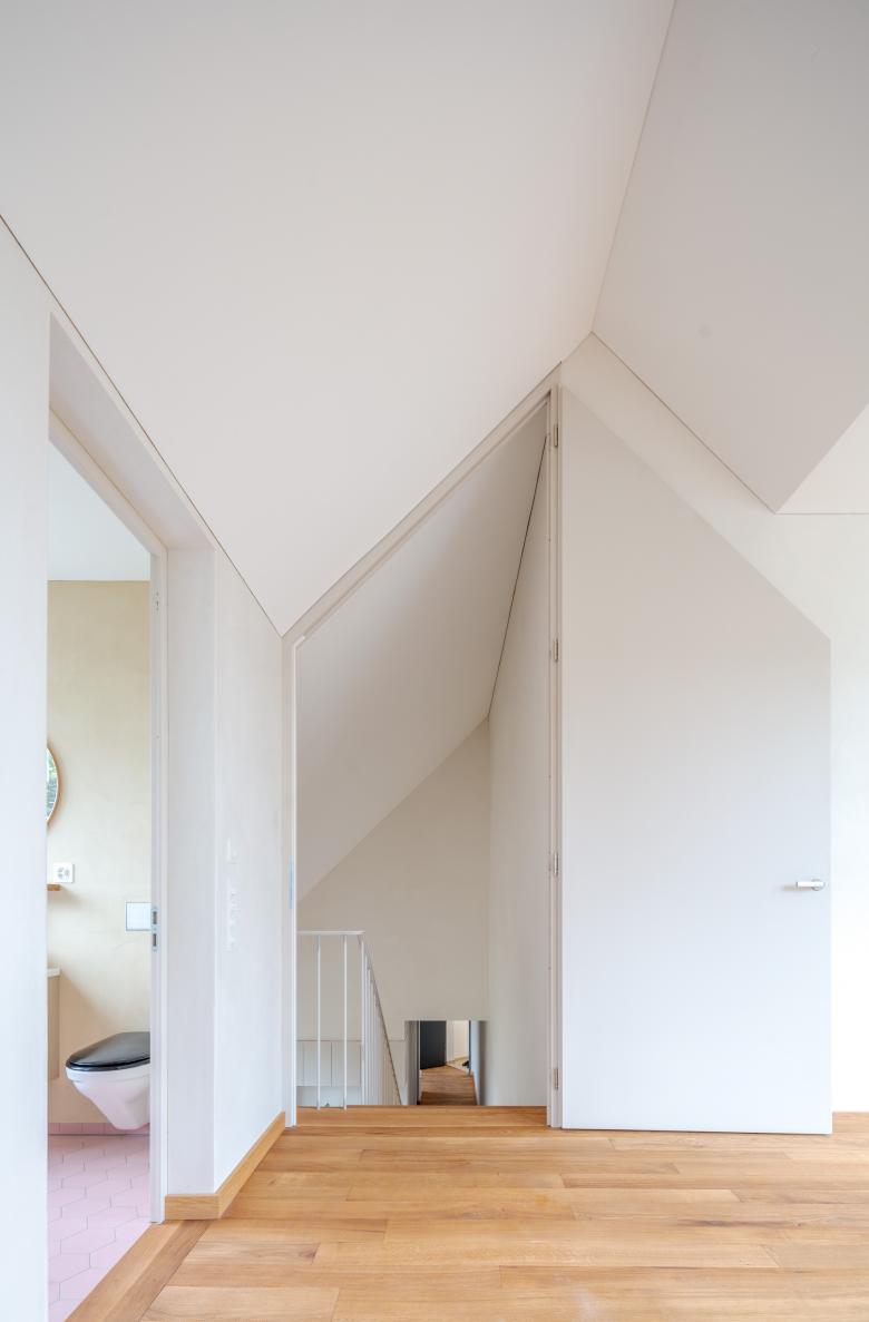 Die Bühne der Häuser an der Schlossstrasse in Rüschlikon sind nicht wie bei vielen Neubauten an den Seeufern die grosse Seefläche, sondern die zwei prächtigen Bäume des ehemaligen Schlossparks, deren Kronen über die Dächer der Bauten ragen. Sie tragen still in sich die Geschichte des Prachtbaus, der Ende des 19. Jahrhunderts entstanden ist. Hier zählt nicht das gewinnbringende Primat der Seesicht, die z.B. bei Terrassensiedlungen als grossformatiger Bildschirm hinter kühlen Glasfronten inszeniert wird. Viel stärker zeichnet das Anliegen, die Idee des Gartens in die Architektur der beiden Häuser einzubinden. Und zwar nicht alleine durch die Abwicklung der äusseren Form, sondern hauptsächlich auch in ihrer inneren Raumdisposition. Hier sitzt man nicht im Kinopalast, wo alle in dieselbe Richtung schauen. Vielmehr befindet man sich auf dem Weg durch den Garten, wo sich die goldene Abendsonne auf der einen und der glitzernde Wasserspiegel auf der anderen Seite abwechselnd die Hand reichen.