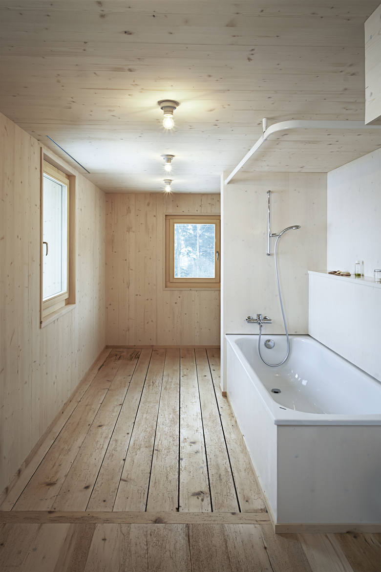Der angebaute Scheunenteil, welcher zur Hälfte unterkellert ist, wurde im Zuge des Umbaus ausgebaut und erweitert die nordöstliche Wohnung um zwei Räume. Im Erdgeschoss war bereits vor dem Umbau ein provisorisches, ungedämmtes Bad untergebracht. Das Bad war sehr klein und kalt, was den Bauherrn zum Ausbau des Scheunenteils veranlasste. Das Erdgeschoss wurde in ein grosszügiges Bad mit inte­griertem Waschküchenbereich umgestaltet. Im Obergeschoss entstand ein kleines, zusätzliches Zimmer, das die Wohnung um den Ausblick nach Nordosten bereichert. Der Umbau ist ein reiner Holzbau, wobei die beiden Seitenfasssaden und das Dach innerhalb der äussersten Schicht der Gebäudehülle gedämmt wurde und die Giebelfassade komplett neu erstellt wurde. Die Nordostfassade wurde wieder mit einem für Appenzellerscheunen typischen Leistenschirm verkleidet. Die An­ordnung der drei Fenster im Obergeschoss erinnert an die typischen Fensterreihen bei Hauptwohnräumen von Appen­zellerhäusern und macht somit die neue Stube in der Fassade ablesbar. Die Innenräume wurden beide komplett in Fichtenholz ausgekleidet und mit einem UV-Schutz behandelt. Im Erdgeschoss wurden die alten Massivholzbohlen geschliffen und wiederverwendet.
