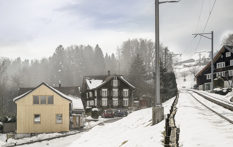 Das Haus in Schwendi bei Heiden besteht aus zwei Wohn­einheiten, die auf eigenartige Weise ineinander verschachtelt sind. Die be­stehenden Wohnräume sind geprägt von niedrigen Raumhöhen, wie sie in traditionellen Appenzellerhäusern üblich sind.