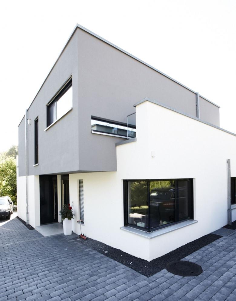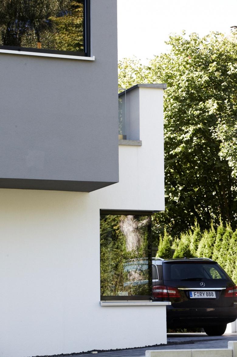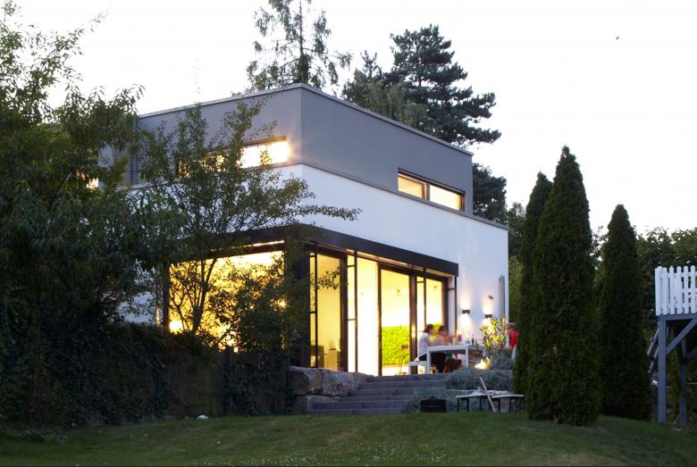 Die Grundidee für den Baukörper entwickelten wir von innen heraus, weil nur eine begrenzte Grundfläche zur Verfügung stand. Das Ergebnis ist ein verschachtelter Baukörper, der zweifarbig gestaltet wurde, um so viel Licht wie möglich ins Innere zu holen und gleichzeitig geringe Einblicke von außen zu gewähren. Die Hanglage stellte eine besondere Herausforderung für die Bebaubarkeit nach B-Plan dar, da das Kellergeschoss kein Voll- oder Gartengeschoss werden durfte.
