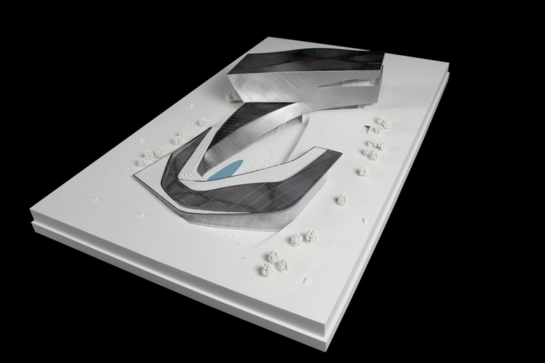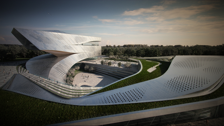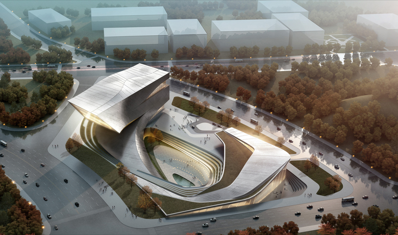 图书馆设计旨在创造打破陈规的创新建筑空间,吸引大连市民来到这一独特的建筑风景线。设计灵感来自中国古代长袍轻盈的流线以及盘根错节树根的稳定性和力度的结合。动态的建筑元素破土而出、与大地编织为一体,形成一系列庭院和地形起伏,生根于大地、向天空伸展,像一棵枝繁叶茂的大树,拔地而起为一个大胆的城市标志。通过体量的转换,营造出私密的庭院空间和动态延展的主楼视线。主楼空间内设置的一系列室内空间节点和梯田空间以加强了空间的层次感和连贯性。包含咖啡馆的一系列零售功能区域,将吸引更多的读者。在中心下客区域的多媒体中心具有独立的区域功能。