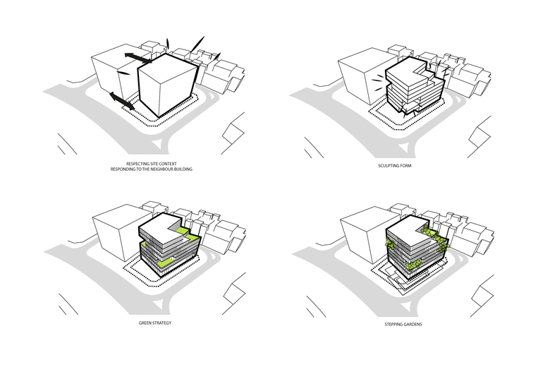 方案的核心为退台式花园概念,将景观从公共落客层和到达层延伸到办公环境中。从大型私密和半私密露台及花园区越过屋面可观赏到滨水风景并在南侧后退至码头区,且为办公空间的东南侧提供了辽阔的景观视野。